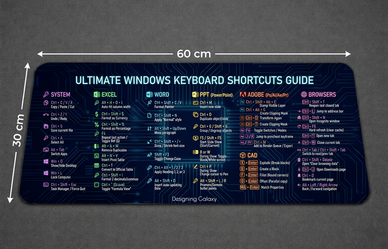 Make your desk smarter with this XL Windows Keyboard Shortcuts Mousepad. Instead of searching shortcuts again and again, you get 50+ essential Windows and software shortcuts right in front of you while working.